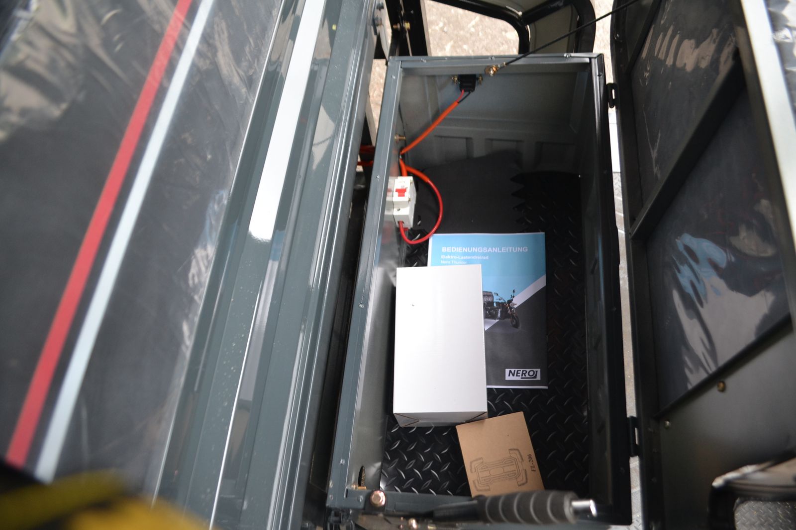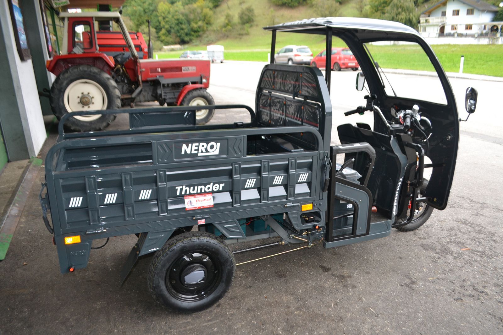mit 600 Watt Elektro-Motor, Maximalgeschwindigkeit von 25 km/h kippbare Ladefläche für bis zu 300 kg mit Fahrerkabine optional Stollenbereifung (Aufpreis 150€ inkl. Mwst) Die leistungsstarke 45 Ah Batterie bringt dich 50 bis 80 km weit und ist innerhalb von 6 bis 8 Stunden wieder voll aufgeladen. Der Thunder zählt in Österreich gesetzlich als Fahrrad – das bedeutet: keine Anmeldung, kein Führerschein, keine Helmpflicht – und du darfst auf öffentlichen Straßen ganz legal unterwegs sein. LAGERMASCHINE- SOFORT VERFÜGBARLaufleistung (km): 0