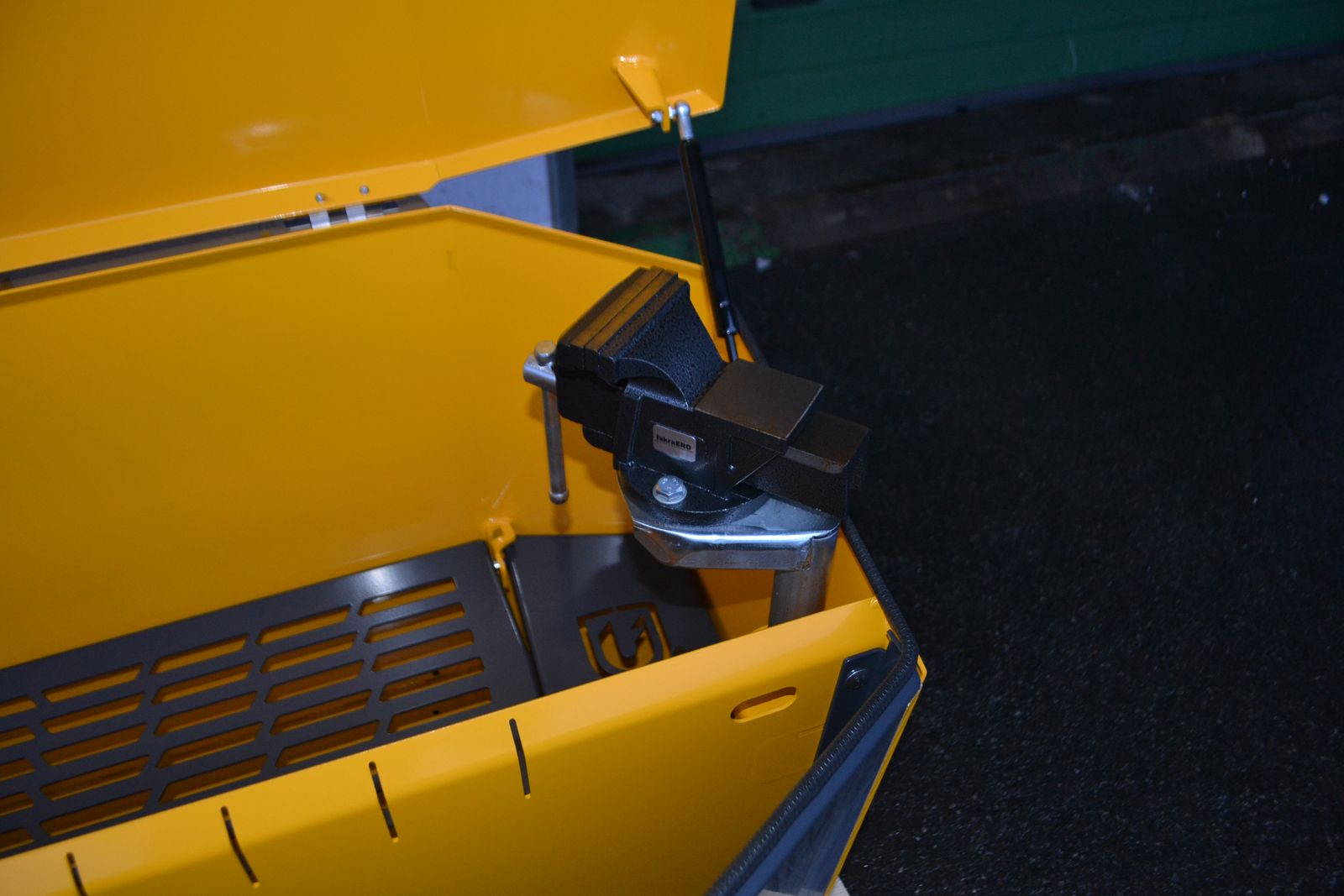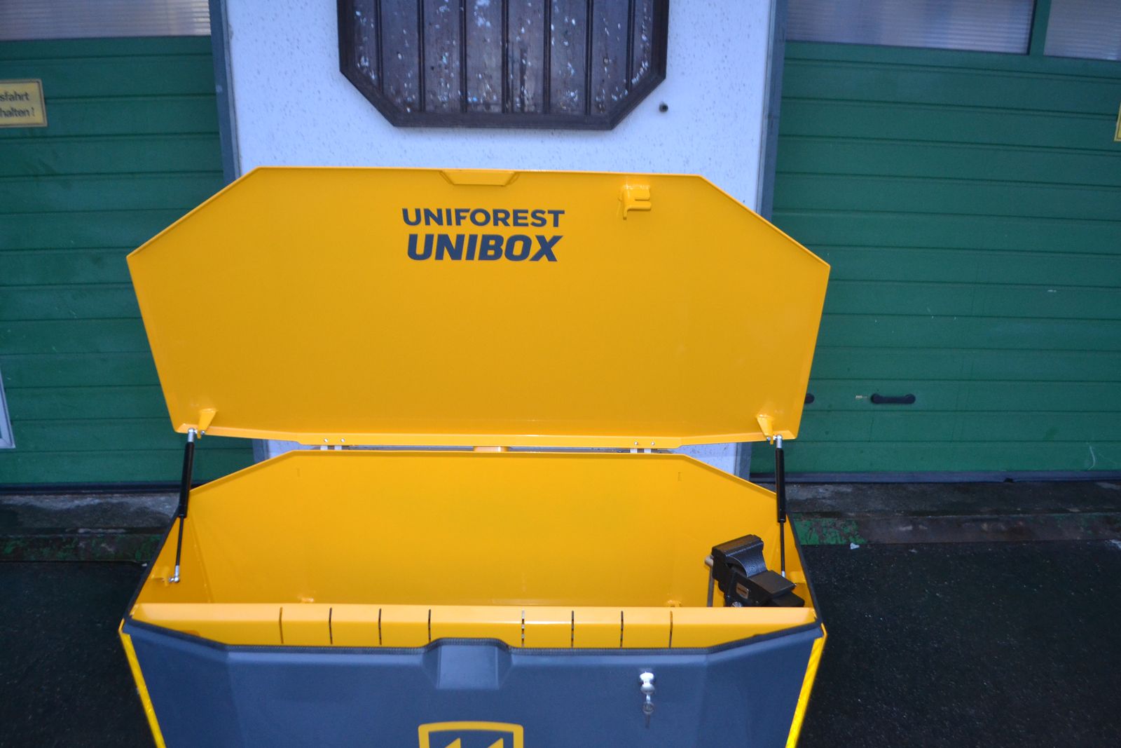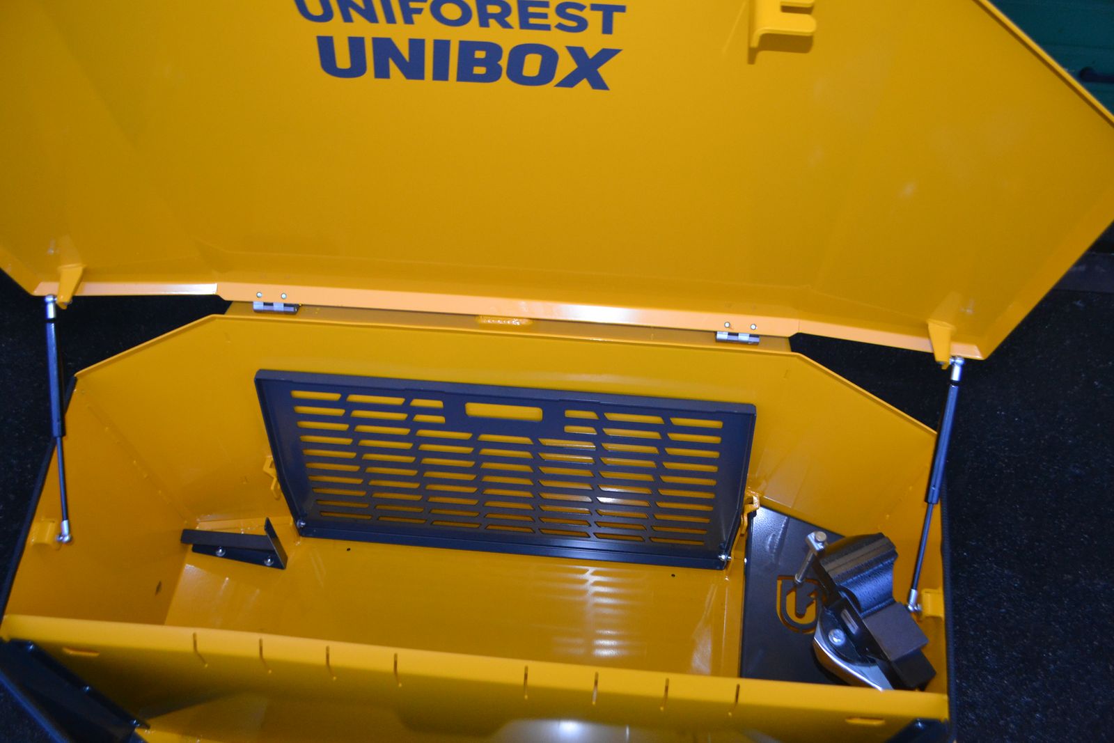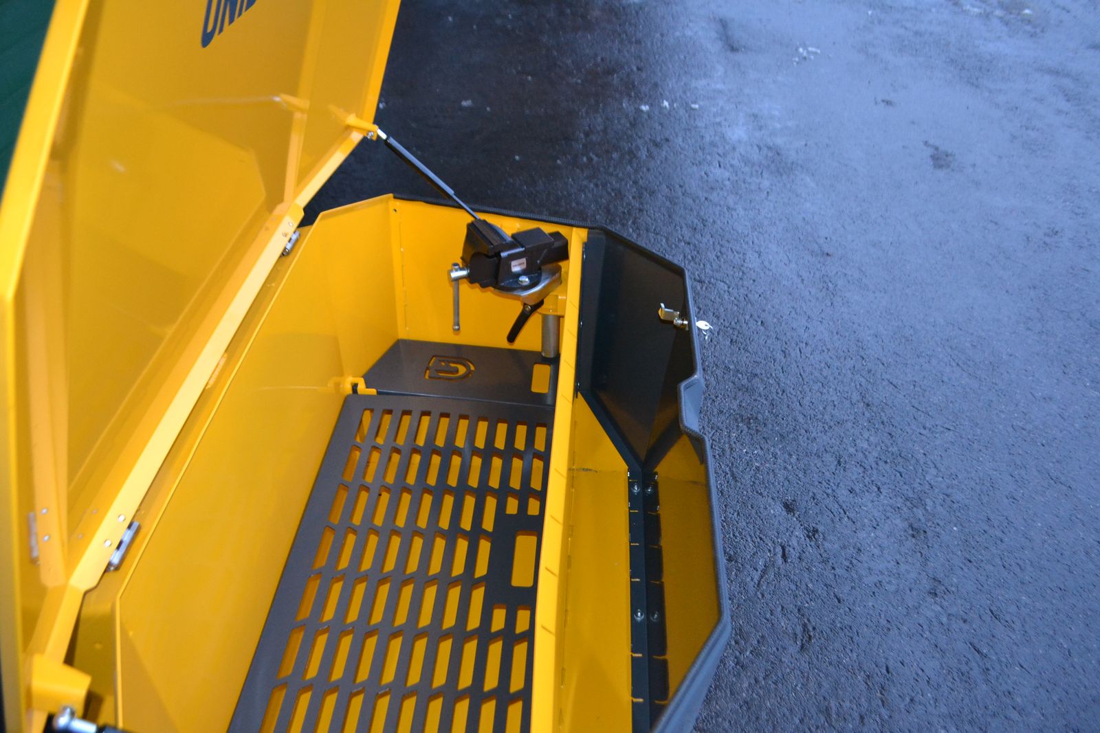 Uniforest Unibox Dreipunktaufhängung Viele Fächer mit patentierten vertikalen Trennwänden und einem mehrstufigen Regal Kanisterträger Zusätzlicher Platz auf der Rückseite Deckel mit Gasdruckfedern Schloss Sicherheitsreflektierende Etiketten inkl. Schraubstock auf einem HalterZul. Gesamtgewicht (kg): 140