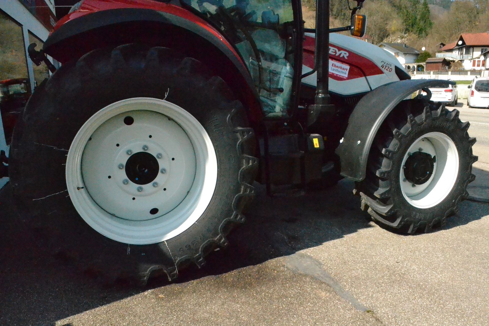 NEUER STEYR PLUS 4120 HD (verstärkte Vorderachse) - Kraftstofftank mit Tankschutz - Viscolüfter - S-Control 2 24x24 Getriebe mit elektrohydraulischen Powershuttle, 2-fach Lastschaltung, 40 km/h bei reduzierter Motordrehzahl, elektrischer Fahrkupplungsbetätigung, hydr. Zapfwellenkupplung S-Stop - Zapfwellengeschwindigkeiten 540/540E/1000bei 1938/1535/1926 U/min Motordrehzahl inkl. AUTO- Funktion inkl. einstellbares Anlaufverhalten - Allradvorderachse 1.5 HD mit hydraulischer Differentialsperre, zulässige Vorderachslast 3.500 kg, Flanschmaß 1.790 mm - 82 l/min Pumpe für Arbeitshydraulik inkl. 36 l/min Lenkungspumpe - 3x Hecksteuergeräte davon 2x mit Schwimmstellung mit Deluxe-Hydraulikkupplungen inkl. Leckölsammelbehälter - 2 Zwischenachssteuergeräte mit mech. Kreuzschalthebel - Außenbedienung für Heckhubwerk und Heckzapfwelle - Elektronische Hubwerksregelung 2 externe Zusatzhubzylinder max. Hubkraft 4.700 kg - mechanisches Fronthubwerk max. Hubkraft 1.670 kg inkl. 7 u. 3 pol. Steckdosen - Pneumatische Anhängerbremse - Luftfedersitz Grammer, Stoffbezug, Armlehnen, Gurt und 15 drehbar - Komfortkabine mit mechanischer Kabinenfederung mit Klimaanlage - Radio - Bereifung Alliance - 8x LED-Arbeitsscheinwerfer - Rundumleuchte linksBereifung vorne: 440/65R24